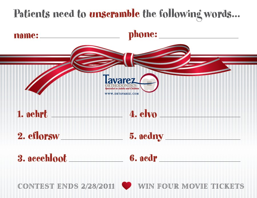 Valentine Contest at Tavarez Orthodontics! Share Article: Search Blog: Search What's your New Year's resolution? Join Dr. Tavarez's SUPER COOL KIDS CLUB! We are THRILLED to announce our VALENTINE "unscramble" CONTEST. All you need to do is unscramble the following words and you could be our winner for 4 movie passes! Contest ends Feb. 14. GOOD LUCK! Tags: Posted on January 4th, 2011 Posted in Uncategorized